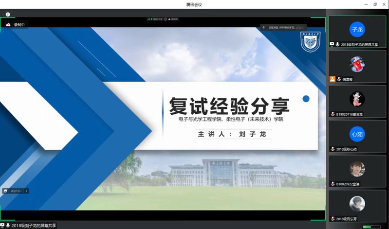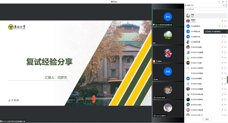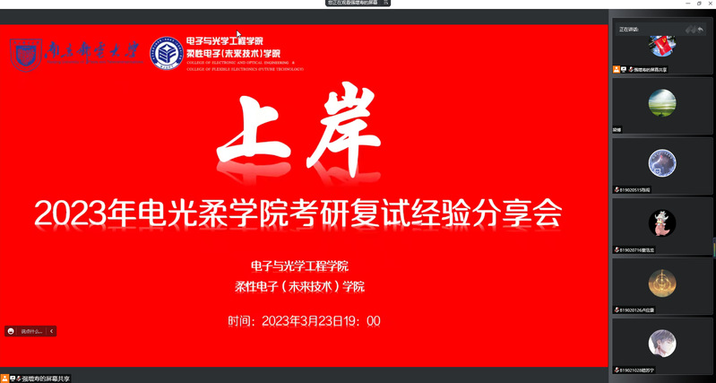 随后,来自东南大学、电子科技大学、北京邮电大学、南京邮电大学的5位我校优秀毕业生依次围绕自我介绍、备考指南、复试心态、选择导师、注意事项等方面分享了自身实际经验。5位同学分别考取不同的高校,他们根据各自的复试经历,提醒同学们需要注意保持良好的心态,临场不要怯场,提前做好各项笔面试的细节准备。