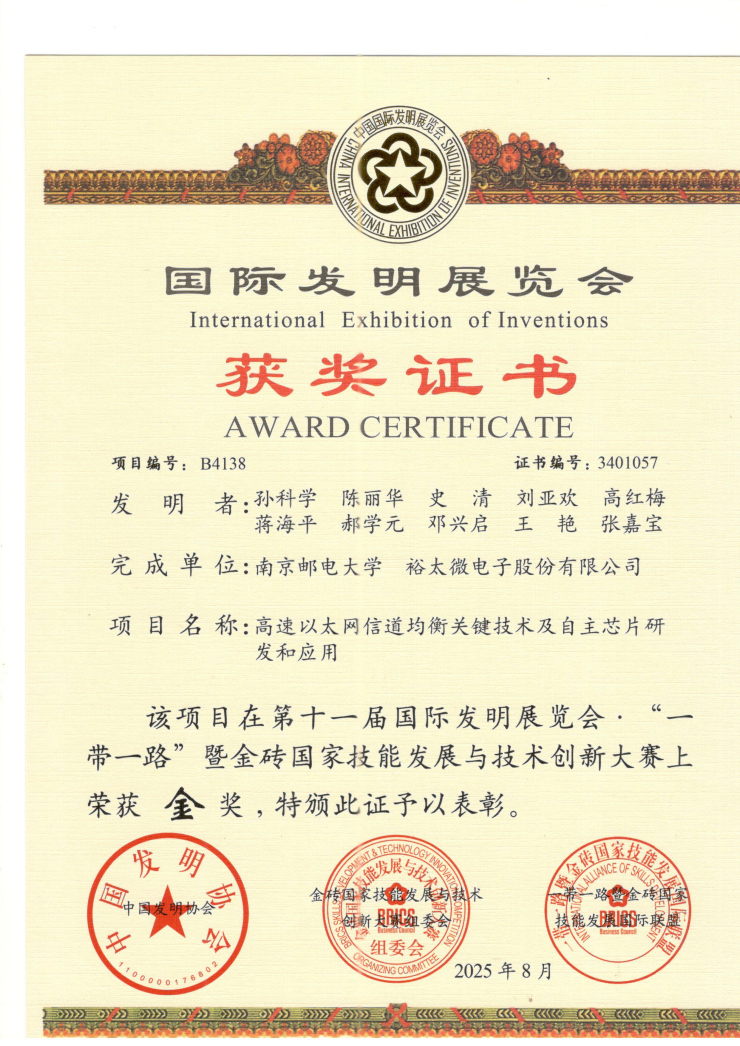 近日,在第十一届国际发明展览会“一带一路”暨金砖国家技能发展与技术创新大赛上,我院孙科学教授团队联合裕太微电子股份有限公司完成的“高速以太网信道均衡关键技术及自主芯片研发和应用”项目,凭借技术创新性与产业应用价值,荣获展会金奖,彰显学院在“产学研用”深度融合领域的扎实实践与显著成效。