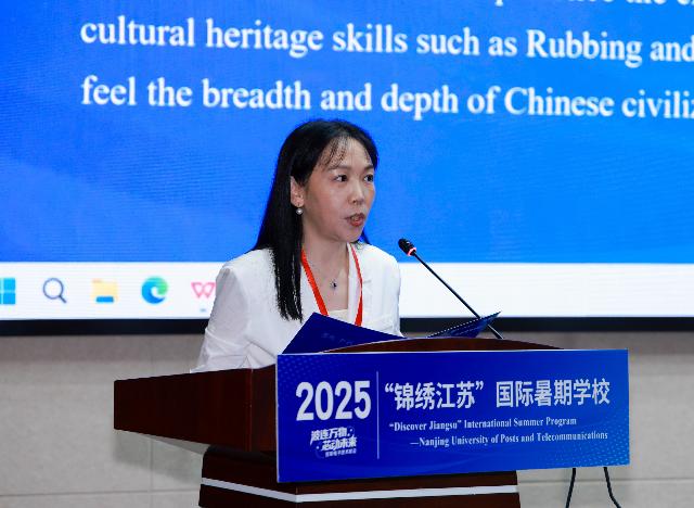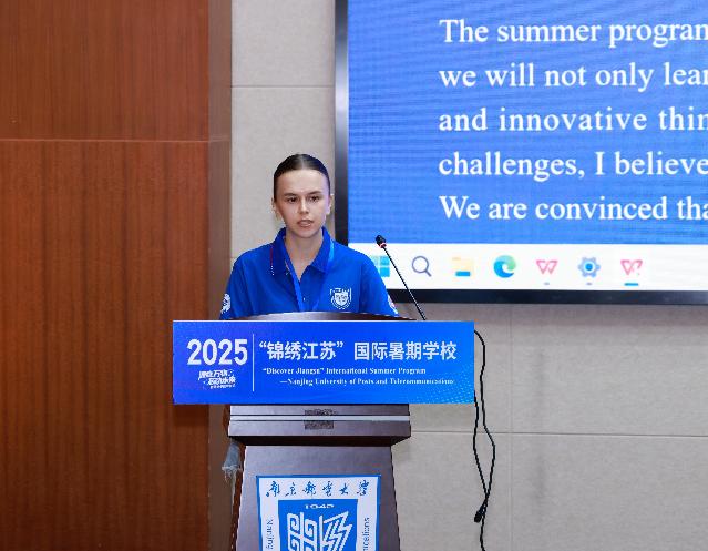 来自俄罗斯的学员佳娜代表国际学生发言,她对南京邮电大学及筹备活动的老师们表示衷心感谢,并期待与志趣相投的伙伴一起积极参与各项课程与活动,探索新知识、新领域,同时深入体验中国传统文化与南京的城市风采。