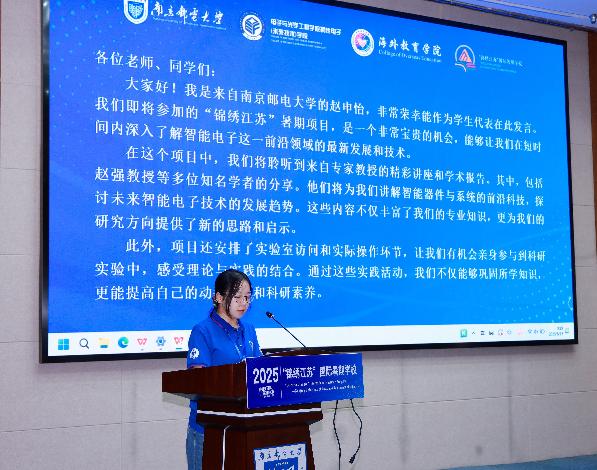 中国学员代表赵申怡在发言中感谢学校提供这一多元化的学习平台,让她能够在学术交流中提升认知,在文化体验中开阔眼界。她表示非常期待通过课程深入了解智能电子技术的最新进展,强化实践与科研能力,并通过文化课程感受南京的历史底蕴与中华传统文化的魅力。