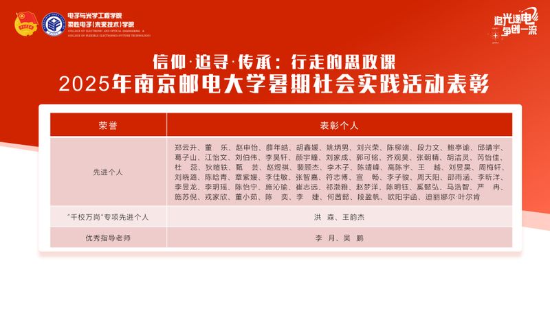 学院制作了“金陵邮梦人!”暑期社会实践专题报道,从265篇投稿实践简报中,精选了16篇制作成优秀实践日志推送。通过本次暑期社会实践,学院进一步擦亮了“信仰·追寻·传承”主题思政品牌,引导广大青年学生在实践中“受教育、长才干、作贡献”,为培养有理想、敢担当、能吃苦、肯奋斗的新时代青年奠定坚实基础。