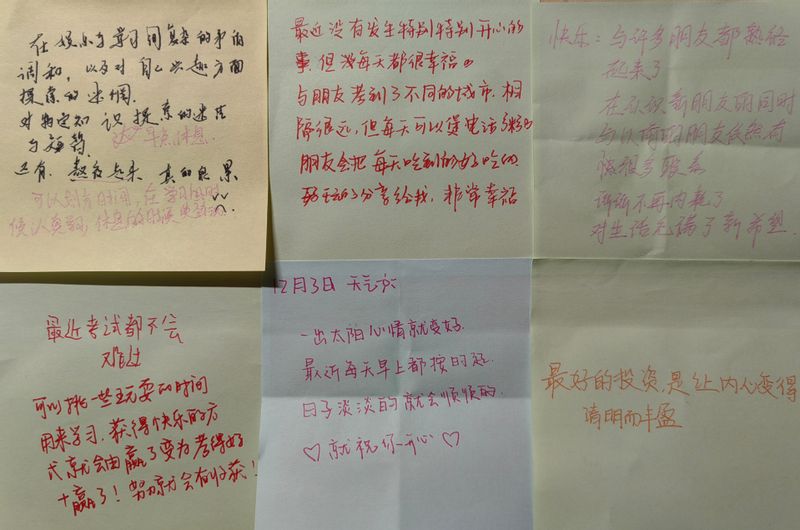 活动持续了数个小时,始终洋溢着舒缓而投入的氛围。许多同学在匿名书写中悄然卸下心防,在品读他人快乐时眼角泛起笑意,更在提笔为陌生人留下鼓励时,触摸到心底柔软而有力的善意。这种轻盈而贴近的互动形式,让情绪自然地流动、传递,于无声处润泽心灵,在交流中点亮理解与共情的微光。